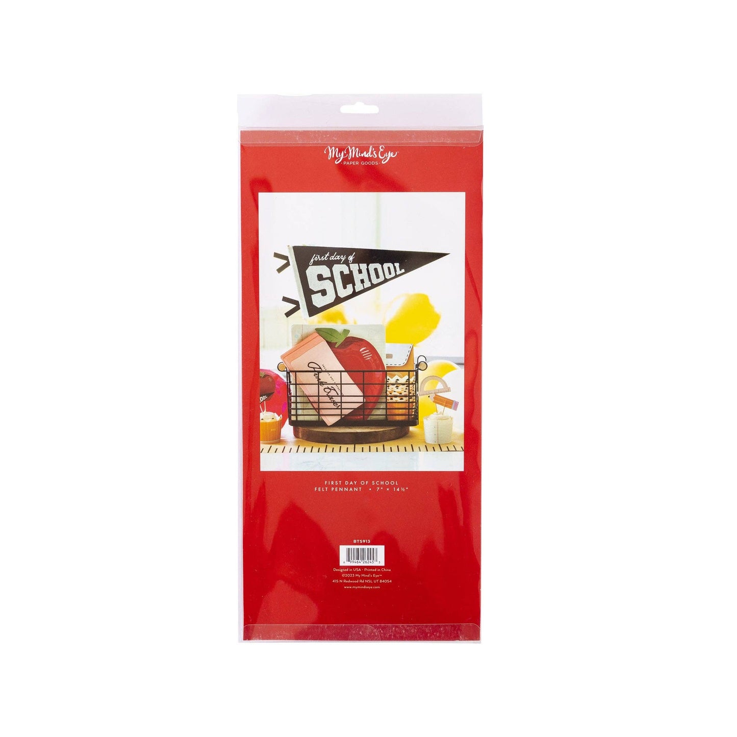 Show First Day of School Spirit with this festive felt banner. Featuring the celebratory phrase "First day of school," this felt banner will bring vintage vibes to first day of school photos, back to school breakfast parties or as the perfect desk decoration for your new favorite teacher!