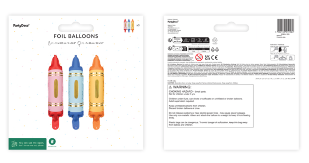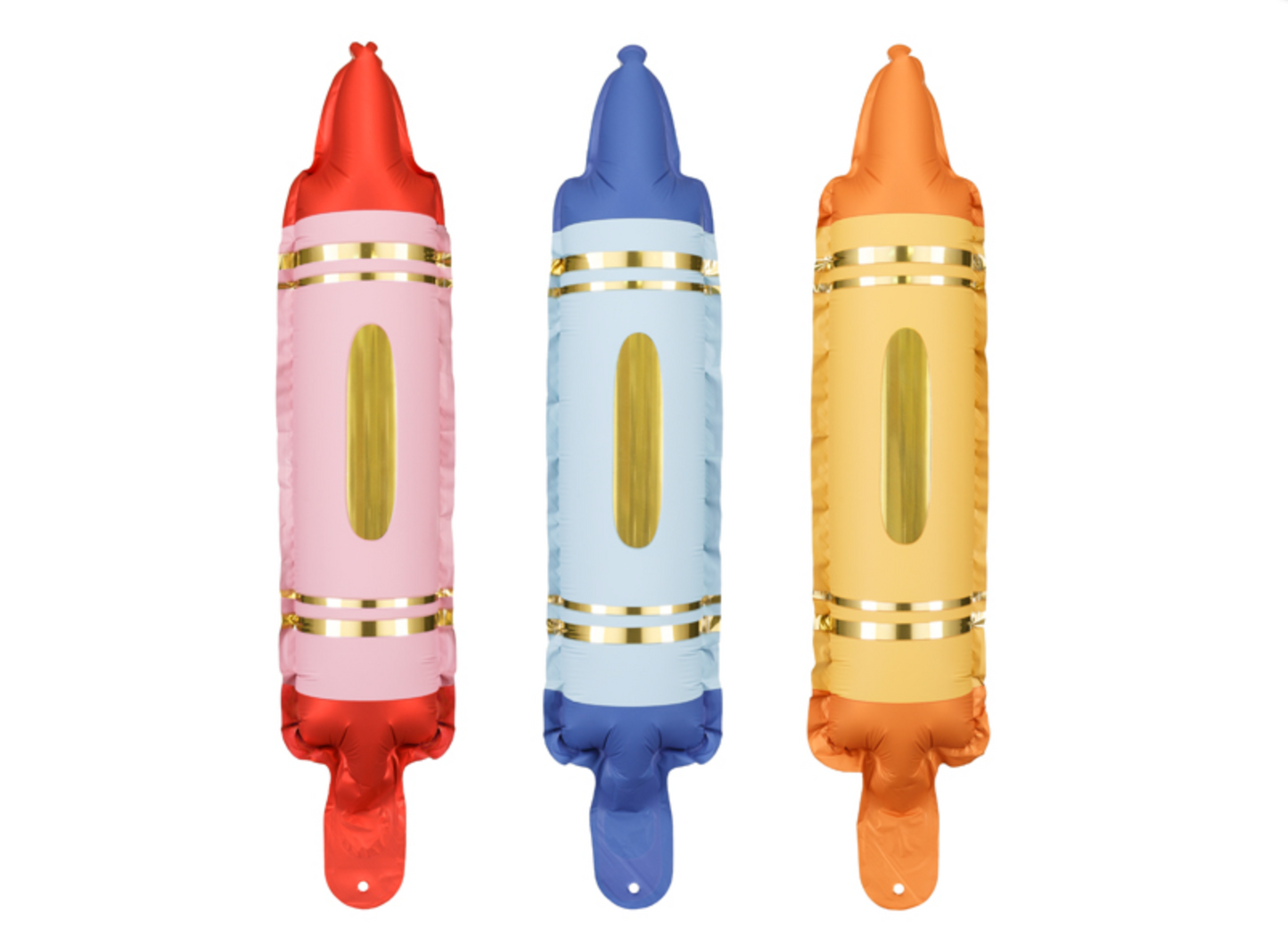 Crayon Foil Balloons for Garlands – Colorful mix! Dimensions: approx. 11 × 32.5 cm before inflation, 7 × 30 cm after inflation. Designed for air inflation. Set includes 3 balloons and a straw.
