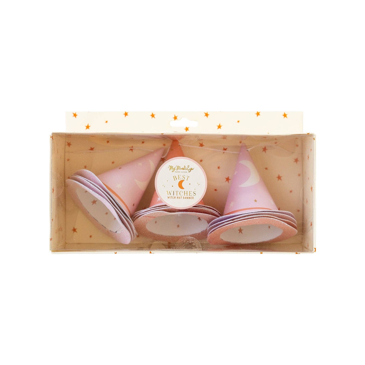 Upgrade your Halloween decor with this playful pink witch hat banner. Bring a touch of whimsy to your holiday celebrations with this unique and festive addition. Perfect for adding a pop of color and charm to any party or gathering.