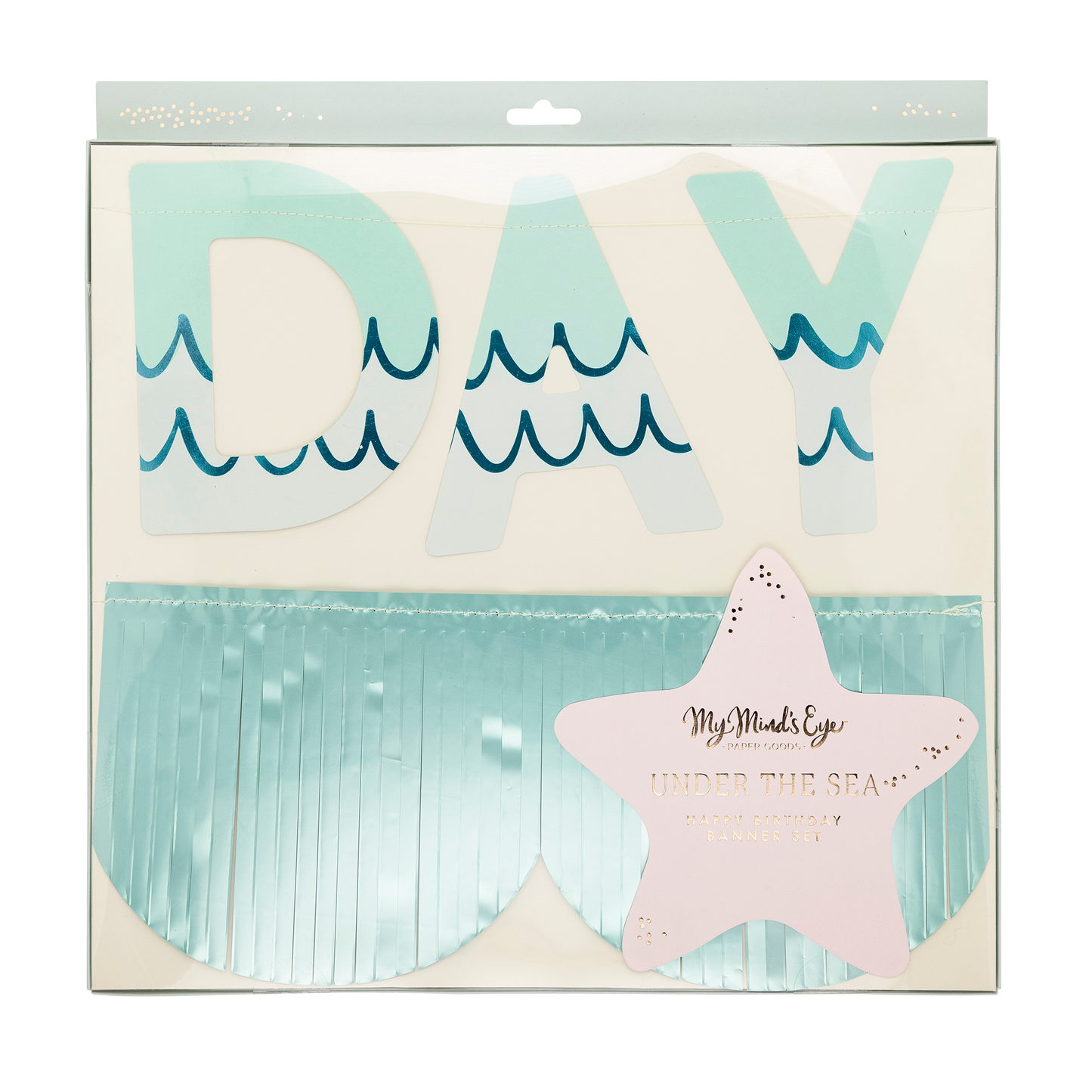 Add an ocean-inspired touch to your next birthday celebration with our Happy Birthday Banner Set! This under the sea banner set features a festive "Happy Birthday" message and includes a fun mylar fringe banner. Get ready to party in style with this unique and playful banner set!