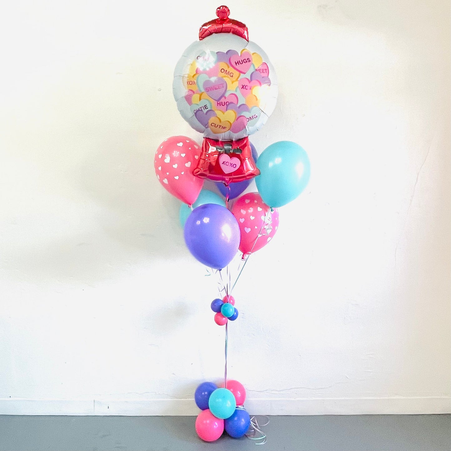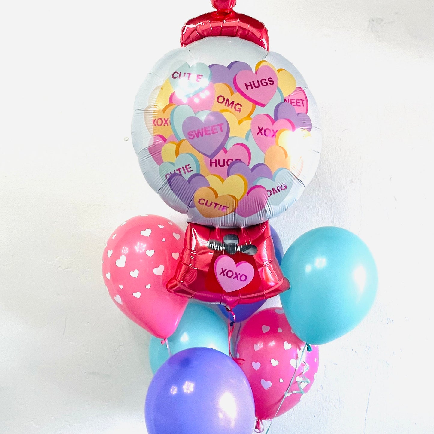 7 Balloon Helium Bouquet. Contains Candy Heart Gumball Machine specialty balloon & 6 latex balloons in various colors. Accessorized with balloon clusters!