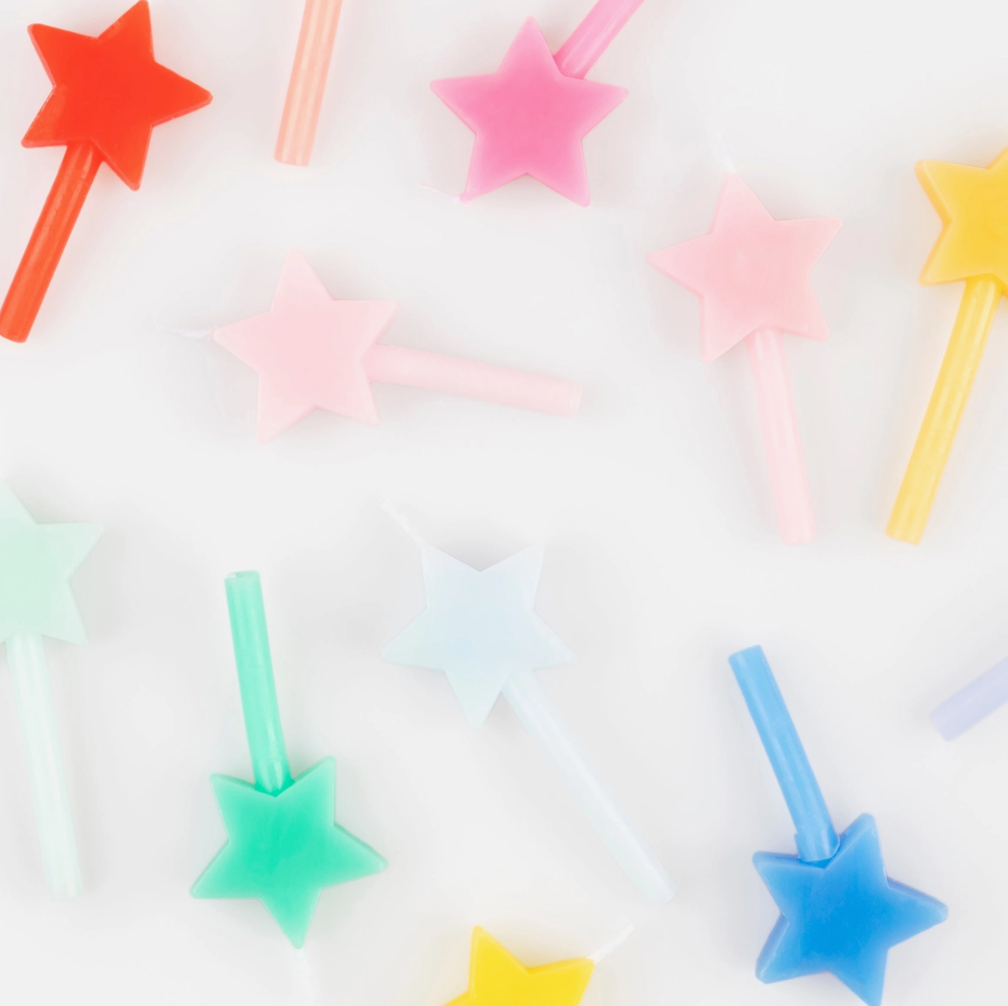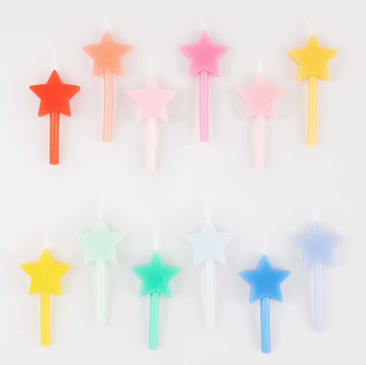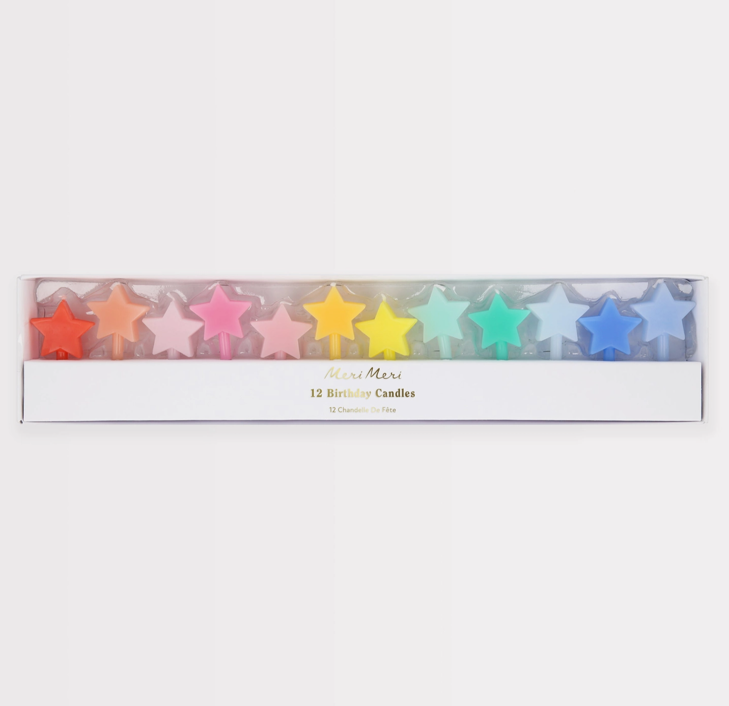 - Set of 12 wax star candles in shades of pink, yellow, blue, and green