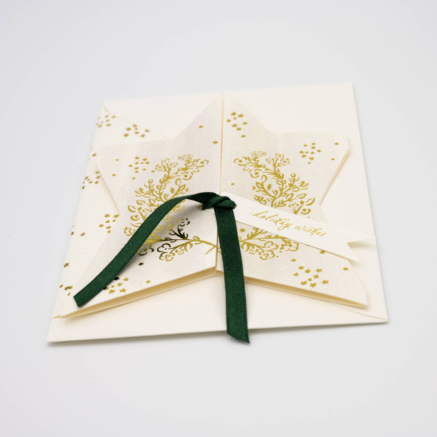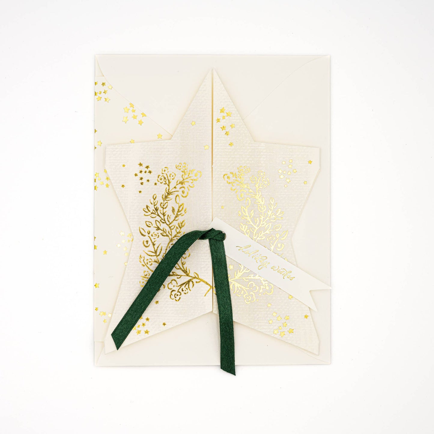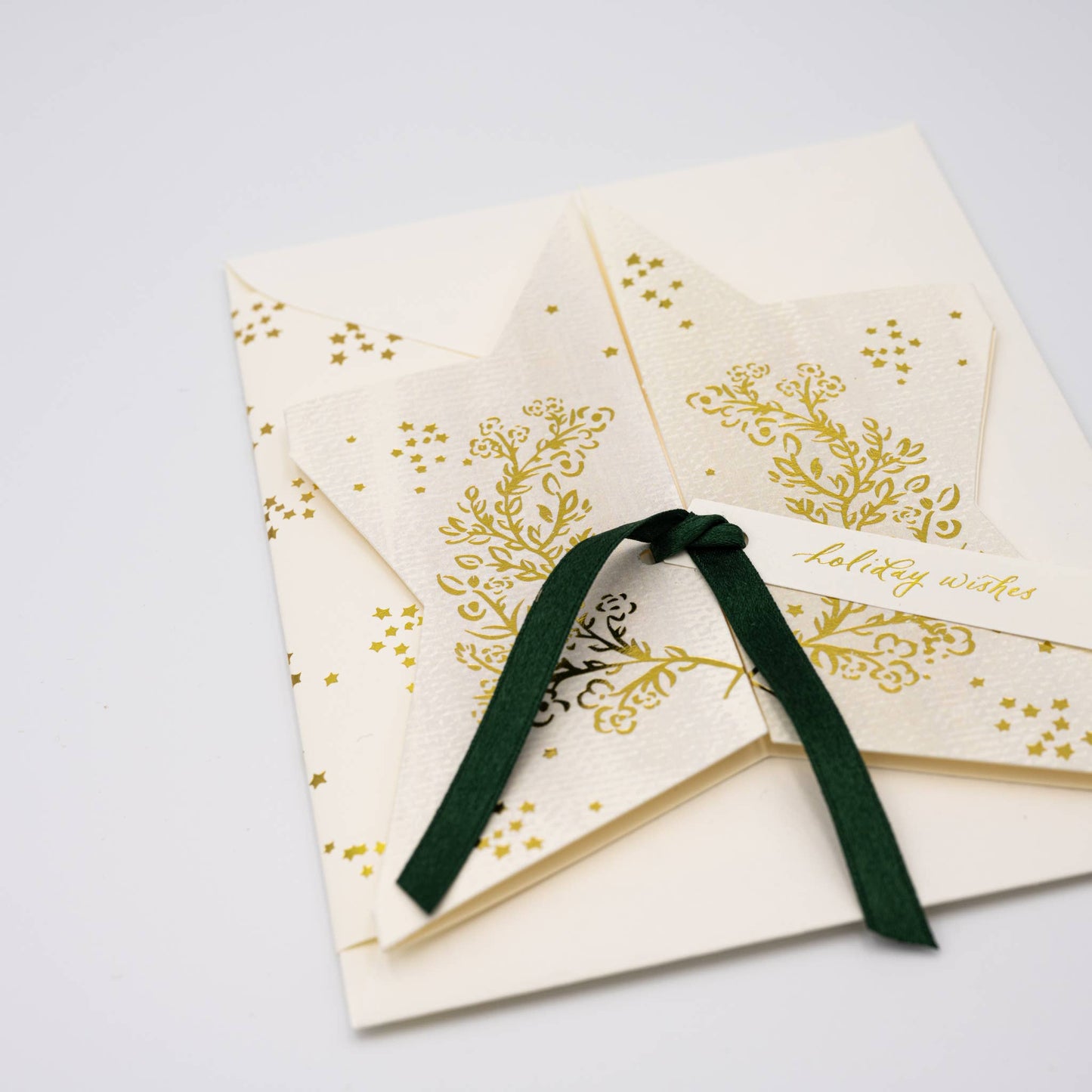 Gold Foil Star Card with Silk Ribbon & Holiday Wishes Tag