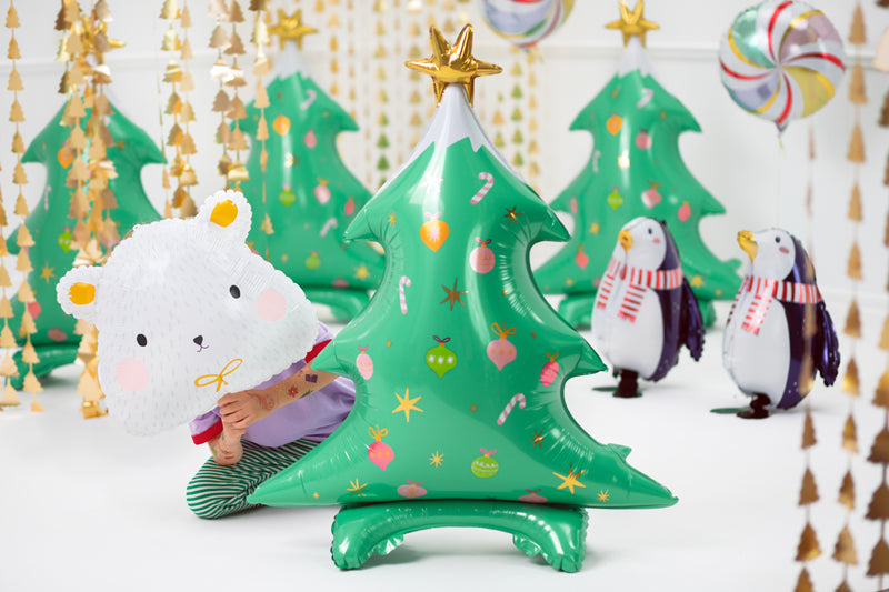 Elevate your kid's Christmas party with instant holiday charm using the Standing Christmas Tree Balloon! This vibrant decoration showcases a giant green Christmas tree adorned with ornaments, candy canes, and a gold star, all displayed on a green pillow balloon. Filled with air, and it stands tall in your Christmas photo booth backdrop. Your kids will adore this festive holiday balloon, bringing joy to their Christmas party. Make your holiday celebration merry and bright with this free-standing balloon.