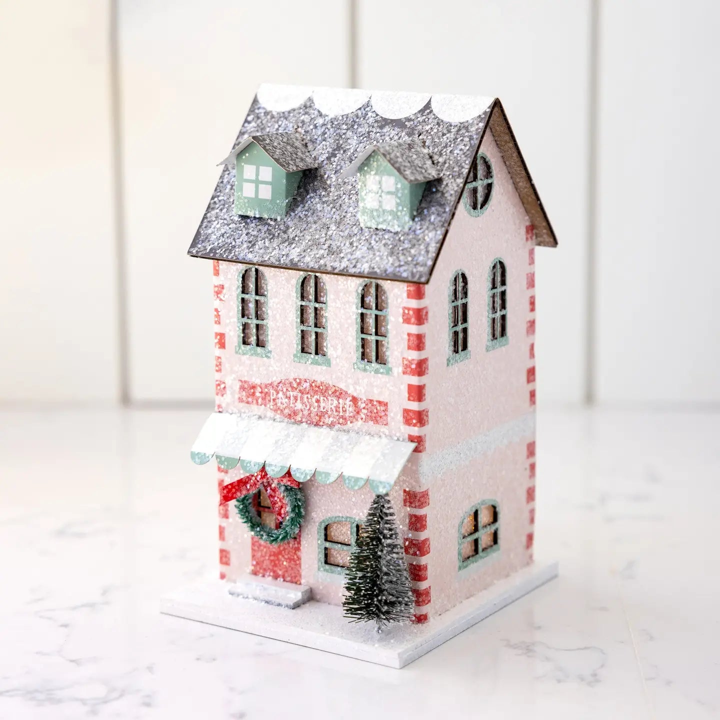 Inspired by traditional Christmas village displays, this bakery comes decorated for the holidays and will make the tablescape at your Christmas party very special. Include this bakery with out church and village house to create a festive Christmas village that is sure to delight your guests this holiday season.