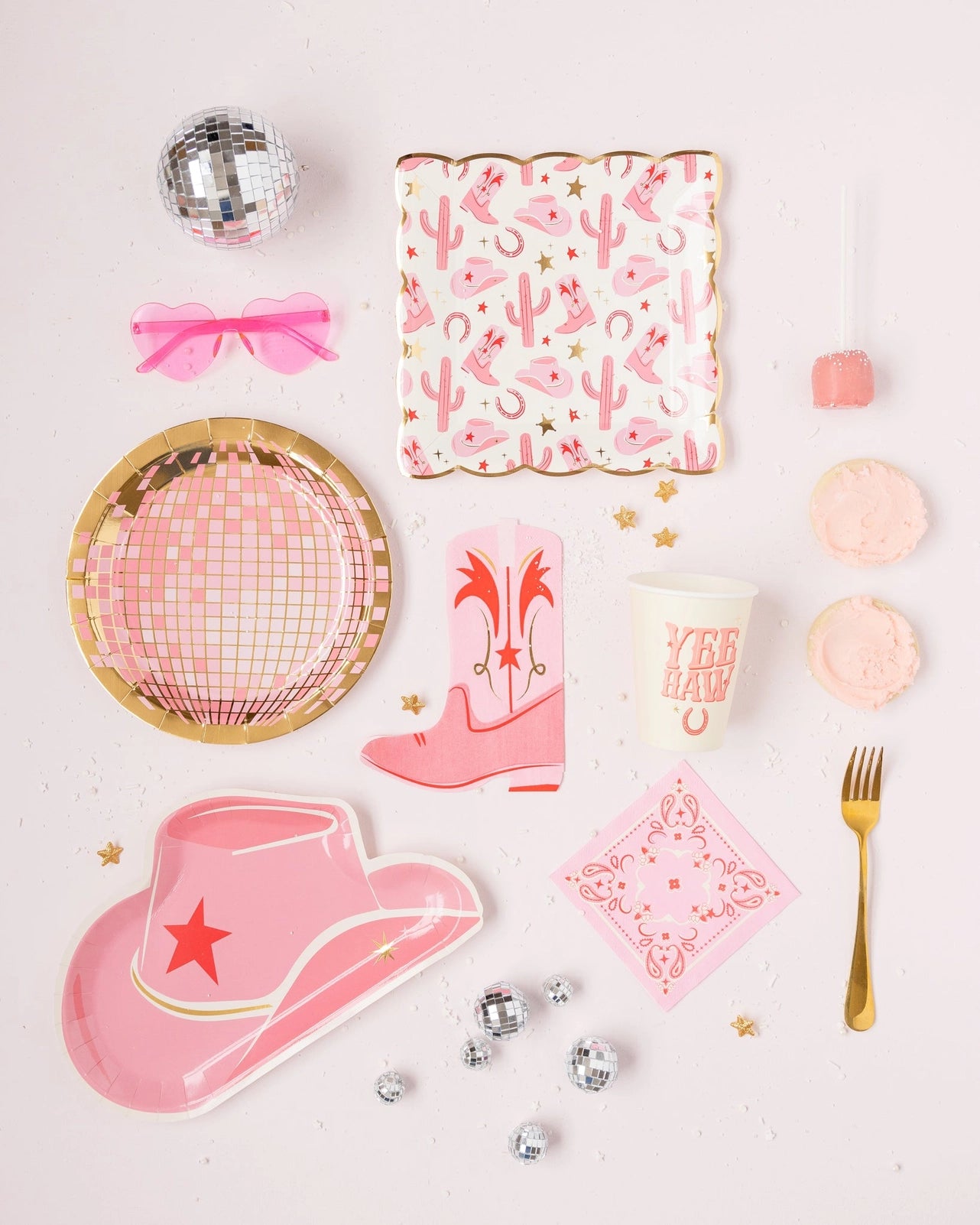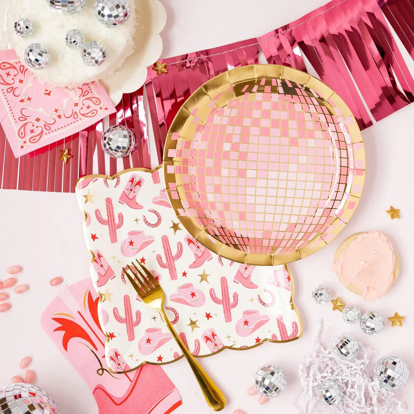 Yee-haw! Saddle up for a wild meal with our Pattern Paper Plate. Featuring a playful cowgirl pattern in pretty pink and shiny gold foil, this plate will add a touch of fun to any party. Round up your friends and get ready to chow down! • includes 8 shaped paper plates • 9" x 9" • gold foil