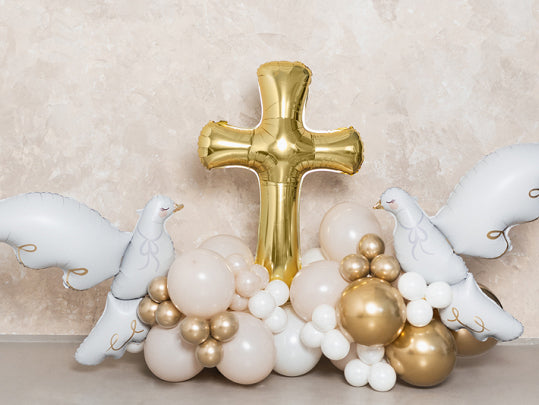 Elegant and symbolic, this gold foil balloon in the shape of a cross makes a meaningful decoration for religious celebrations, christenings, or memorials.