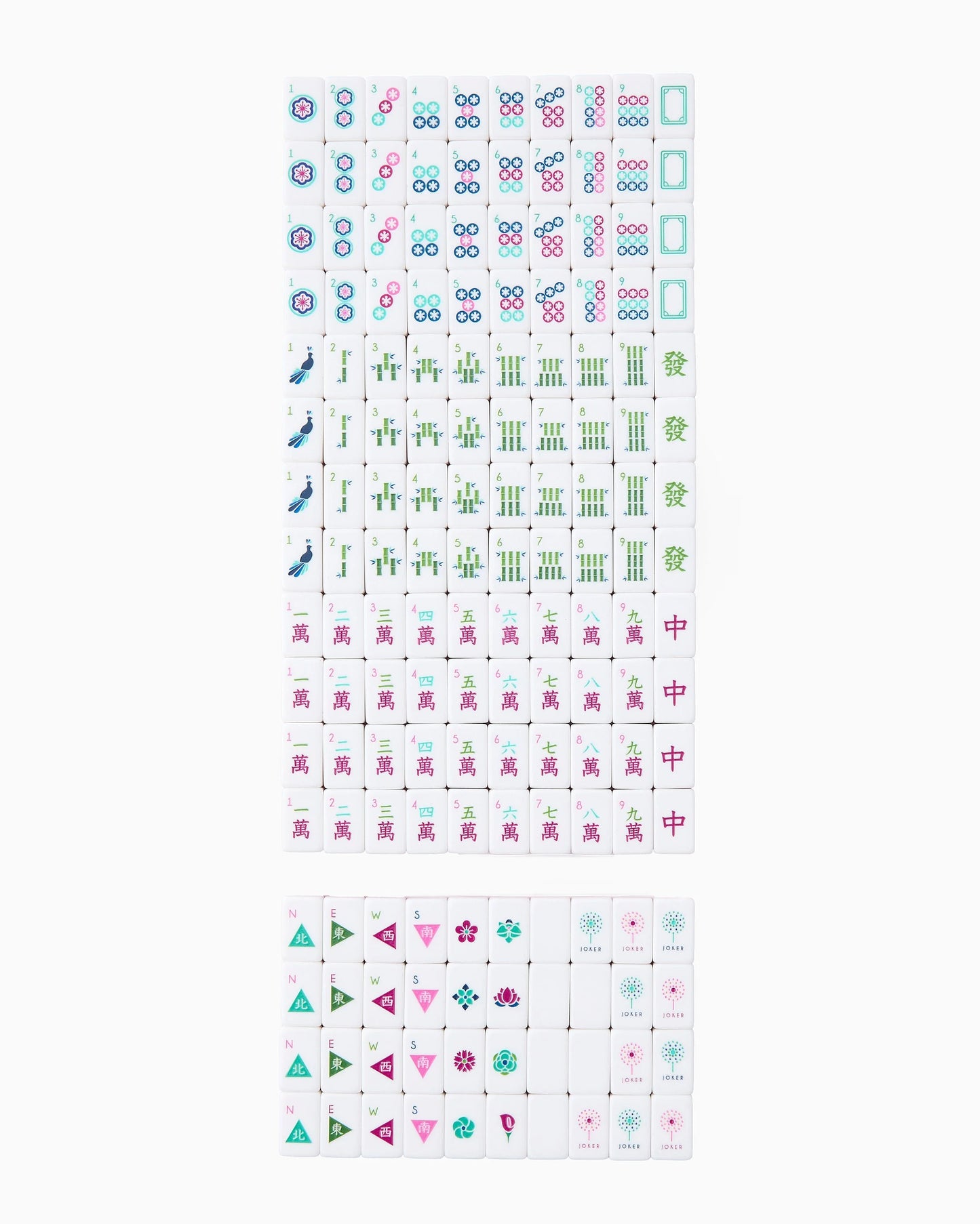 This set, comprising 160 plum, chartreuse, teal and coral, pink-toned tiles, includes 152 traditional tiles, 6 blanks, and 8 jokers, this set is paired with pristine white wooden racks, a chartreuse zippered storage pouch and a generous teal 22" x 22" mat. It seamlessly marries convenience with charm.