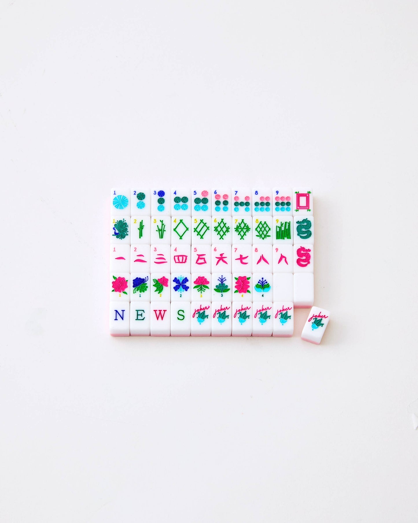 The set includes 160 Mahjong Tiles, 4 White Wooden Racks, Mahjong Mat, Tile Tote and Travel Bag that carries everything.