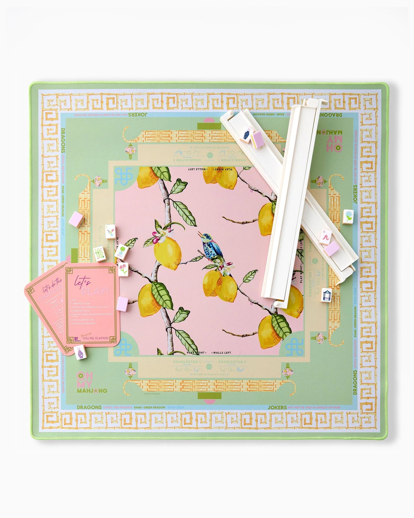 Add a touch of elegance and whimsy to your game with the Citrus Songbird Mat, a stunning collaboration with CoCo Zentner! Featuring a soft blend of pale green, pink, and yellow, this mat is adorned with a charming design of lemons and a delicate watercolor bird. Its graceful colors and intricate details bring a refreshing, artistic vibe to your mahjong sessions.