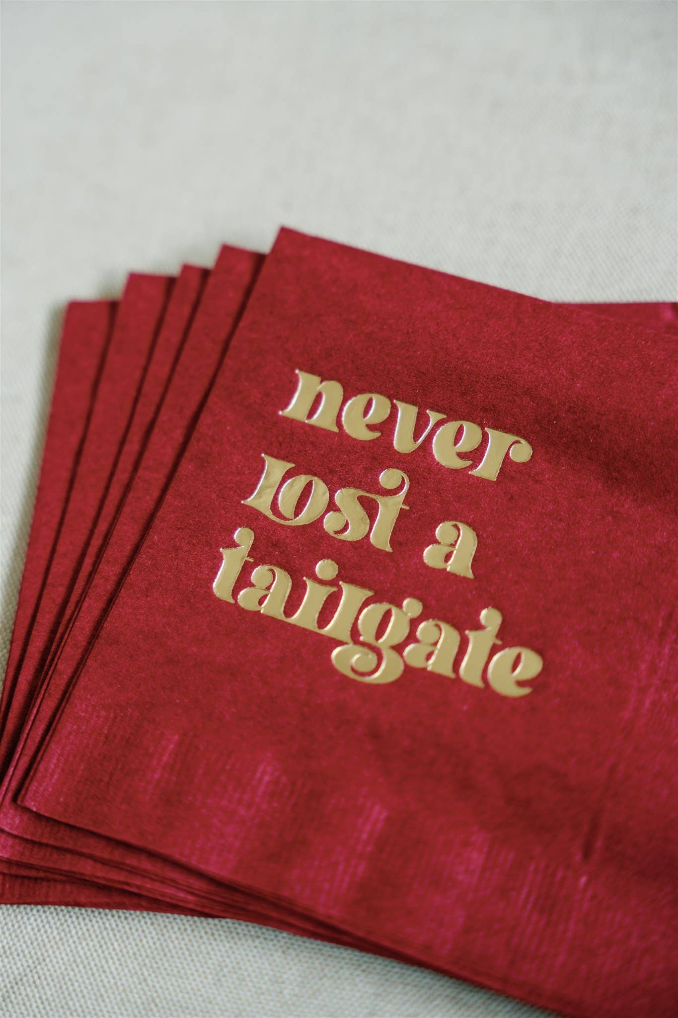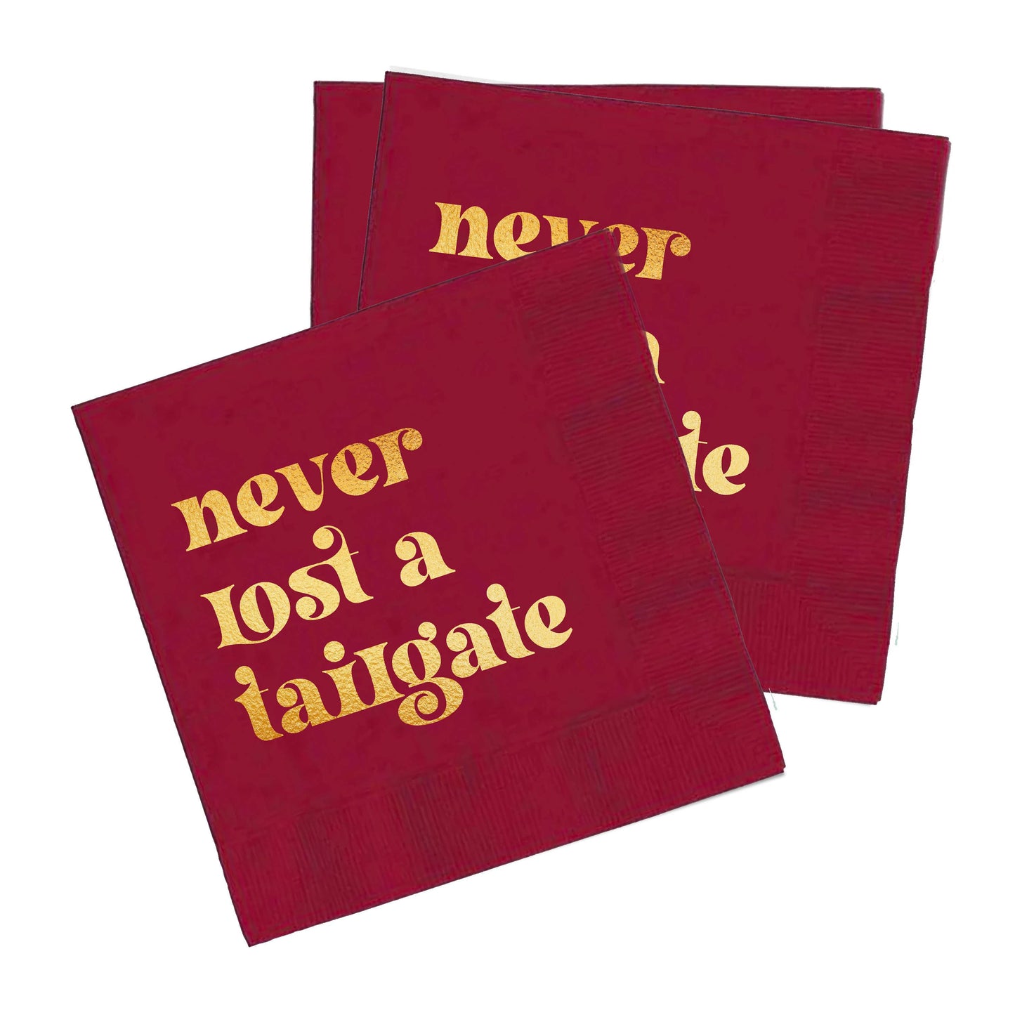 "Never Lost a Tailgate" gold foil + red napkin pack