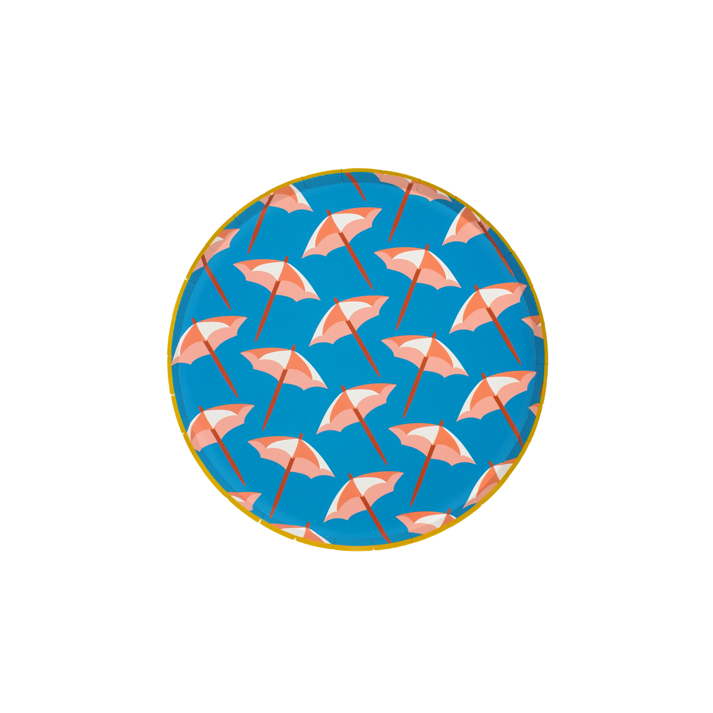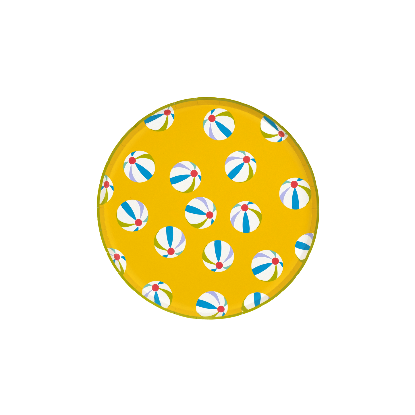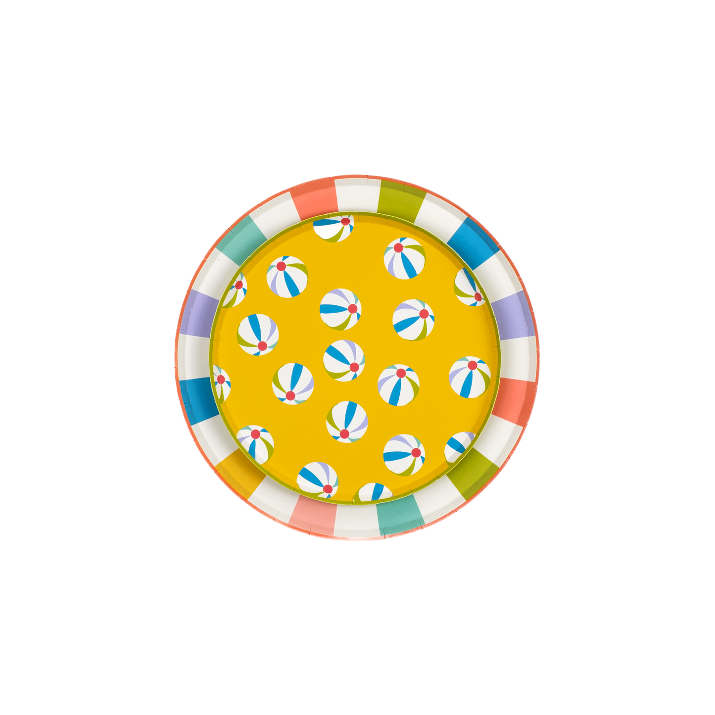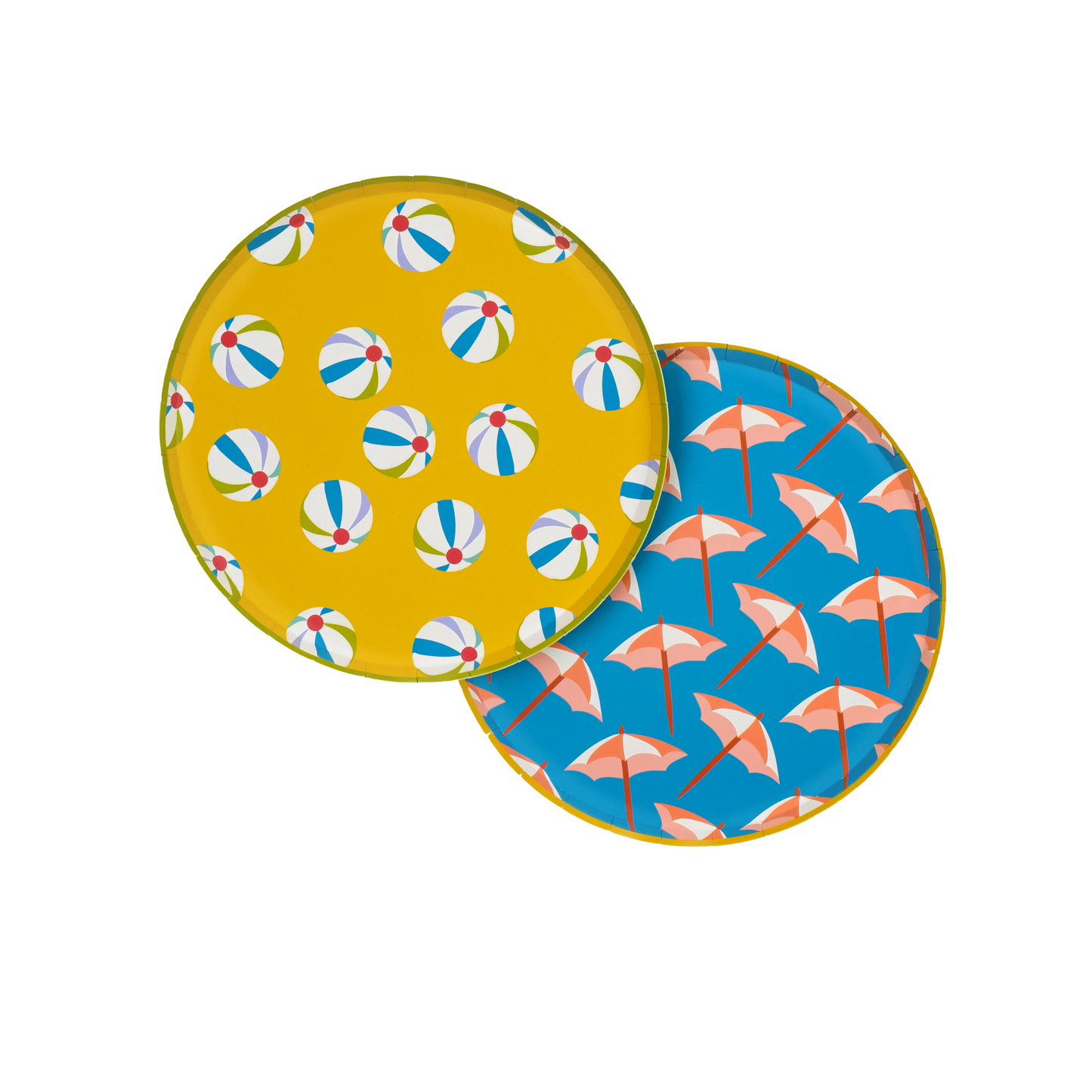 The dessert plates feature vibrant summer-themed designs that are playful and colorful. The blue plate showcases a repeating pattern of pink and white beach umbrellas, evoking a sunny day at the beach. The yellow plate is adorned with cheerful beach balls in shades of blue, green, and red, adding a fun