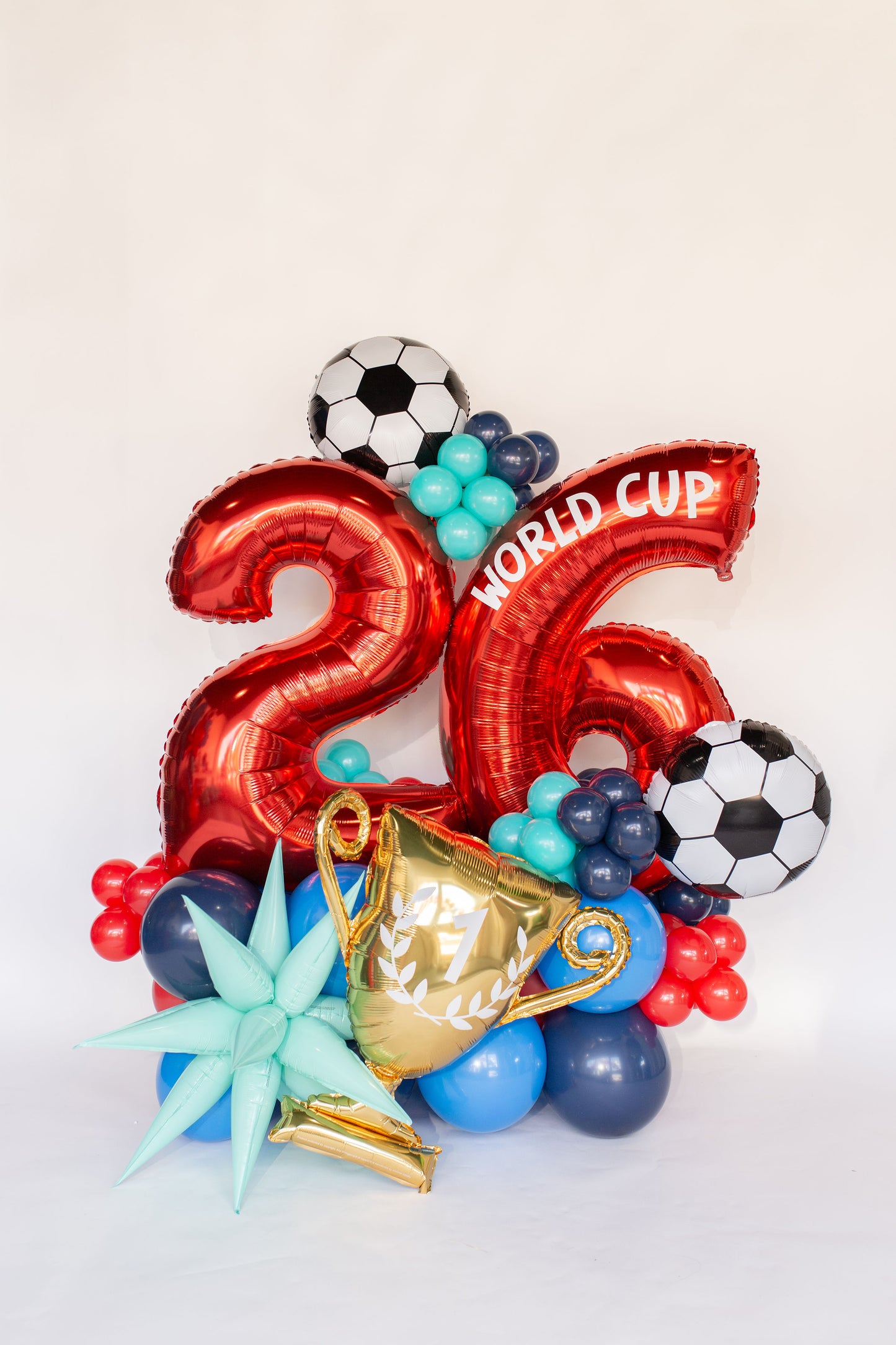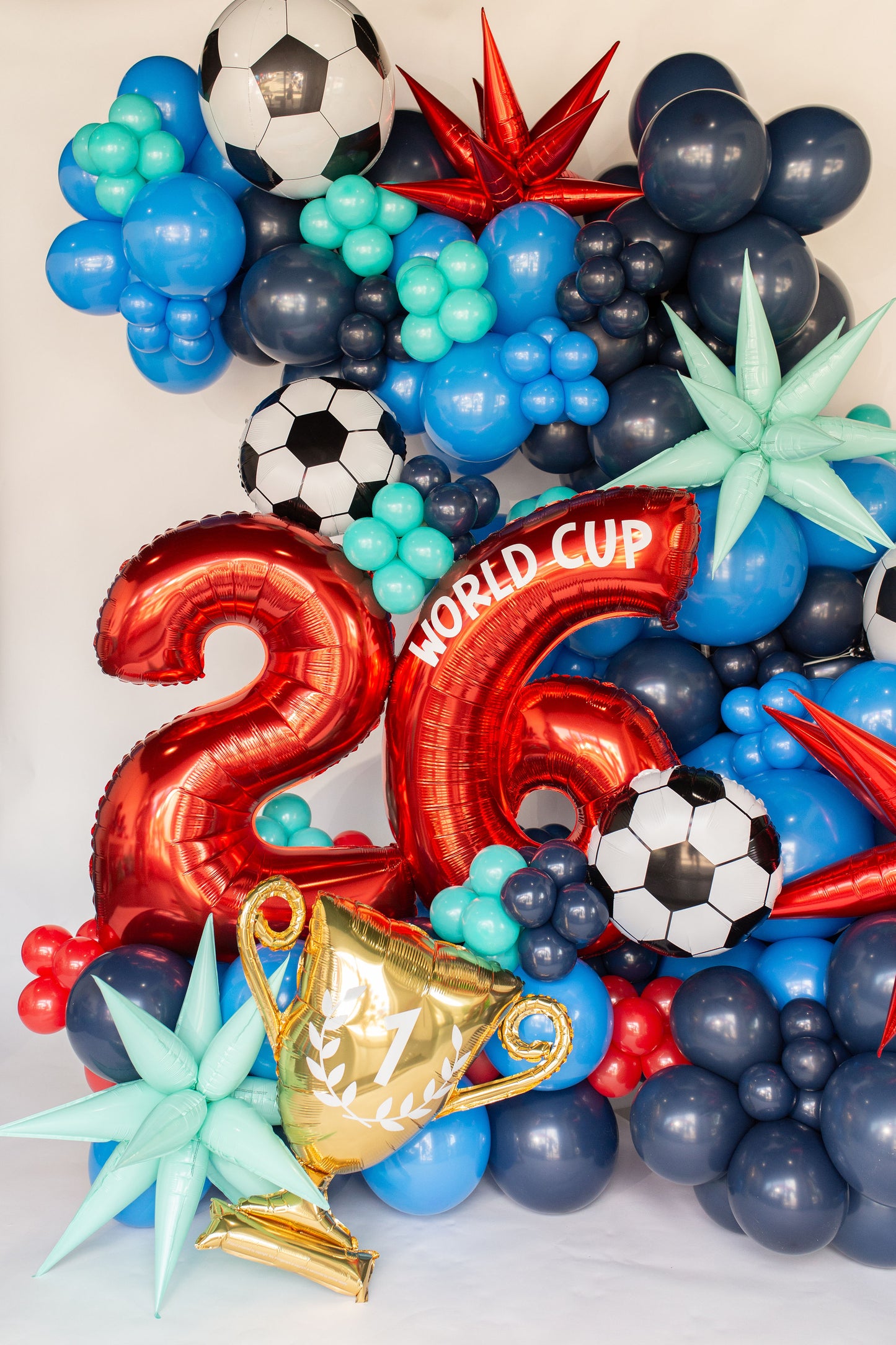 Visually stunning design: Carefully crafted with a combination balloons, including black-and-white soccer balls, colorful accents, and team-color details.
