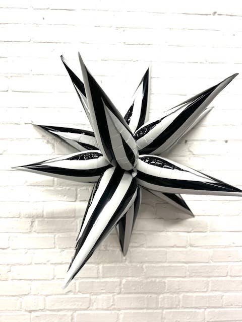 Upgrade your party decor with our 40" Black & White Stripe Starburst. No need to go overboard with complicated decorations - our bag of 12 pieces will do the trick to create one starburst. Just add air, and voila! You've got yourself a fun statement piece. Perfect for Halloween, Circus, sports or anytime you need to pump up your decor! DOES NOT FLOAT!
