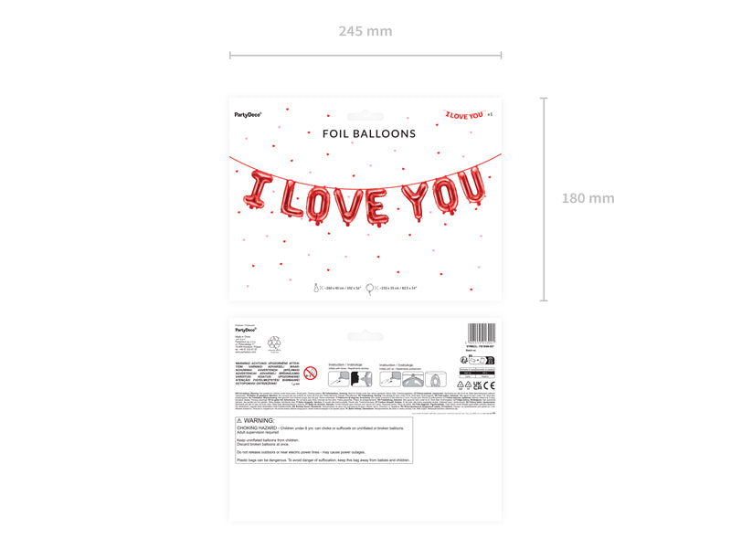 Metallic foil balloon I Love You in red color, size before inflation approx. 102" x 16'', size after inflation approx. 82.5" x 14''. Inflate with air. Set contains a straw and a ribbon
