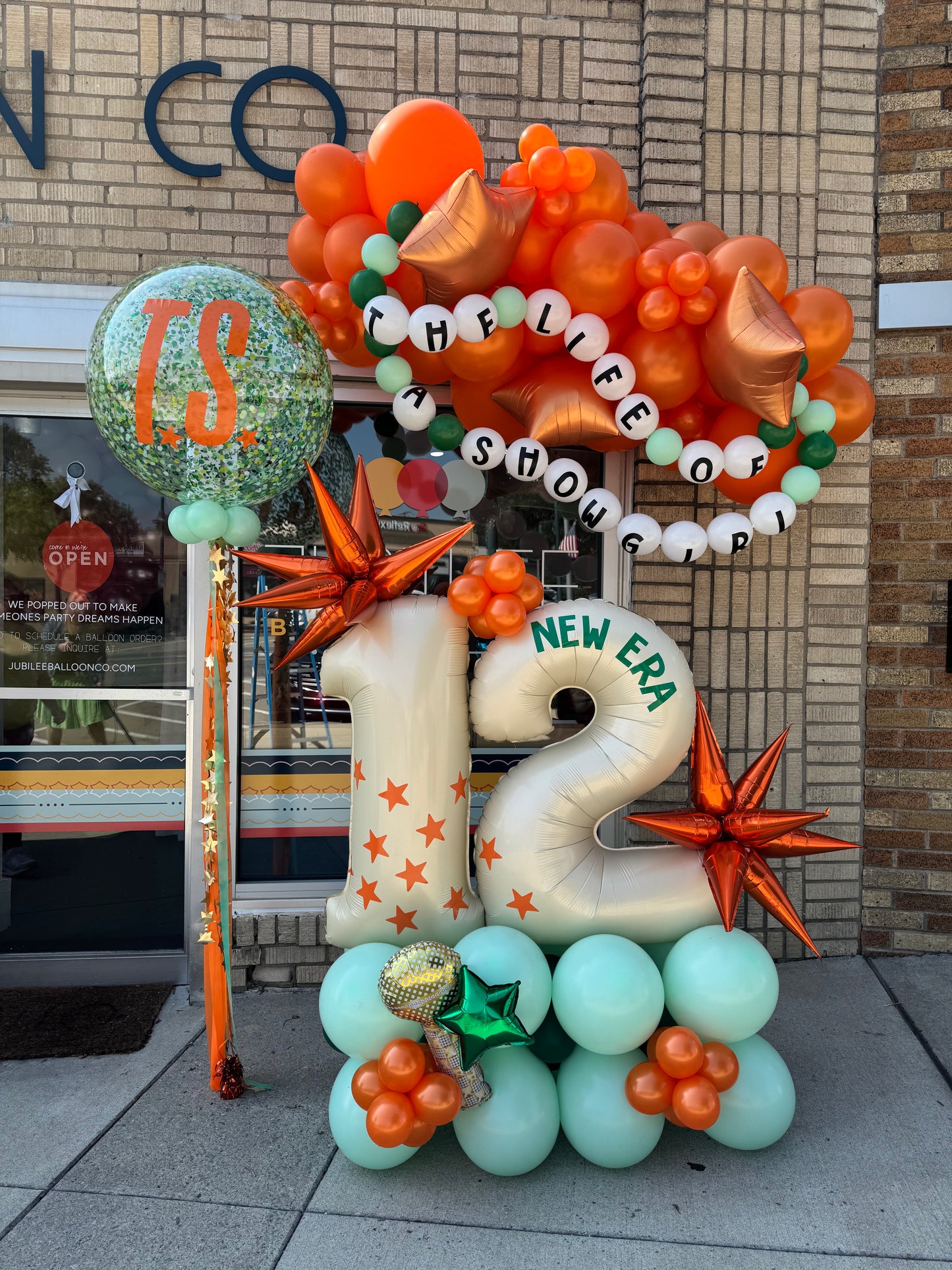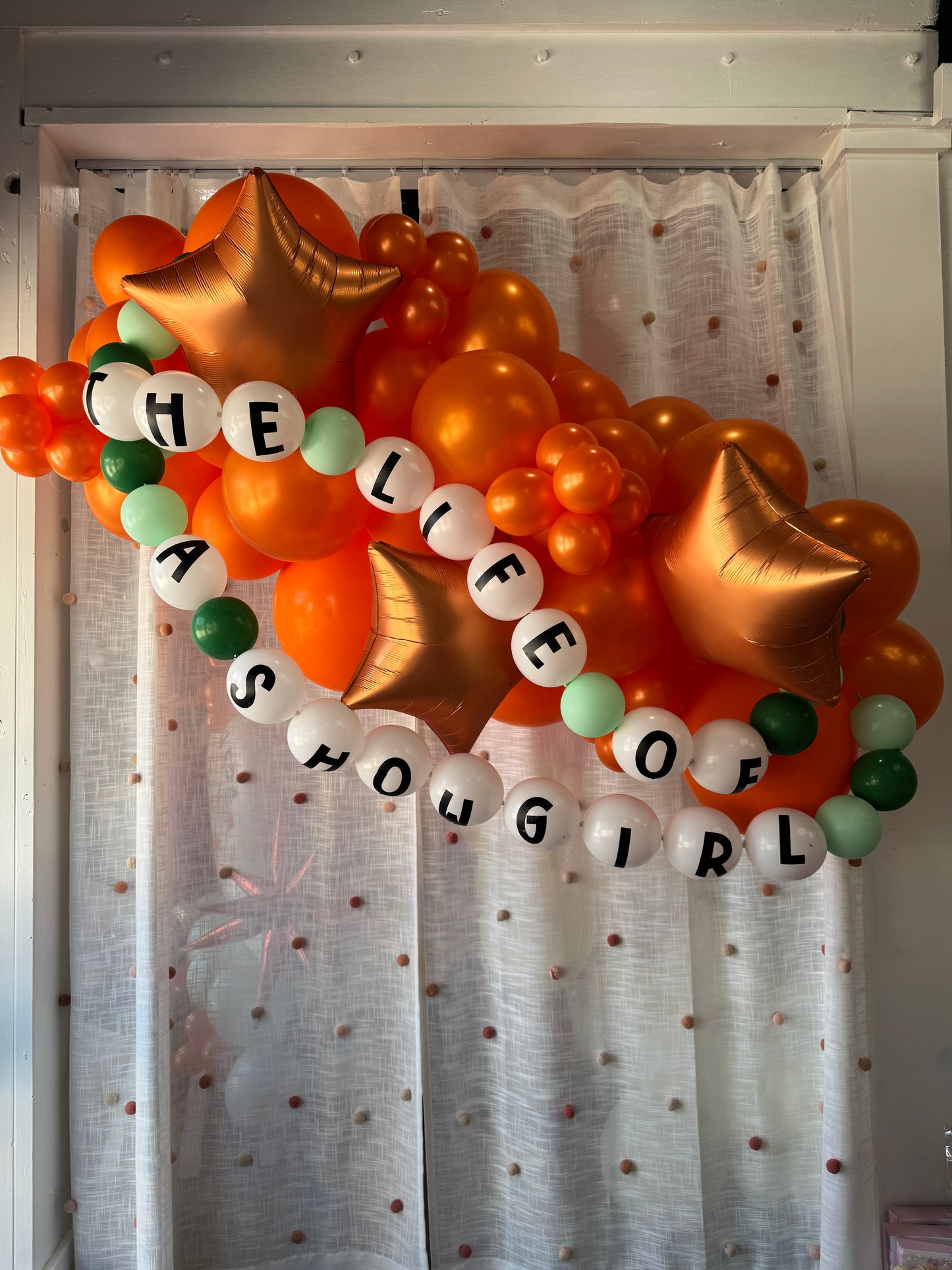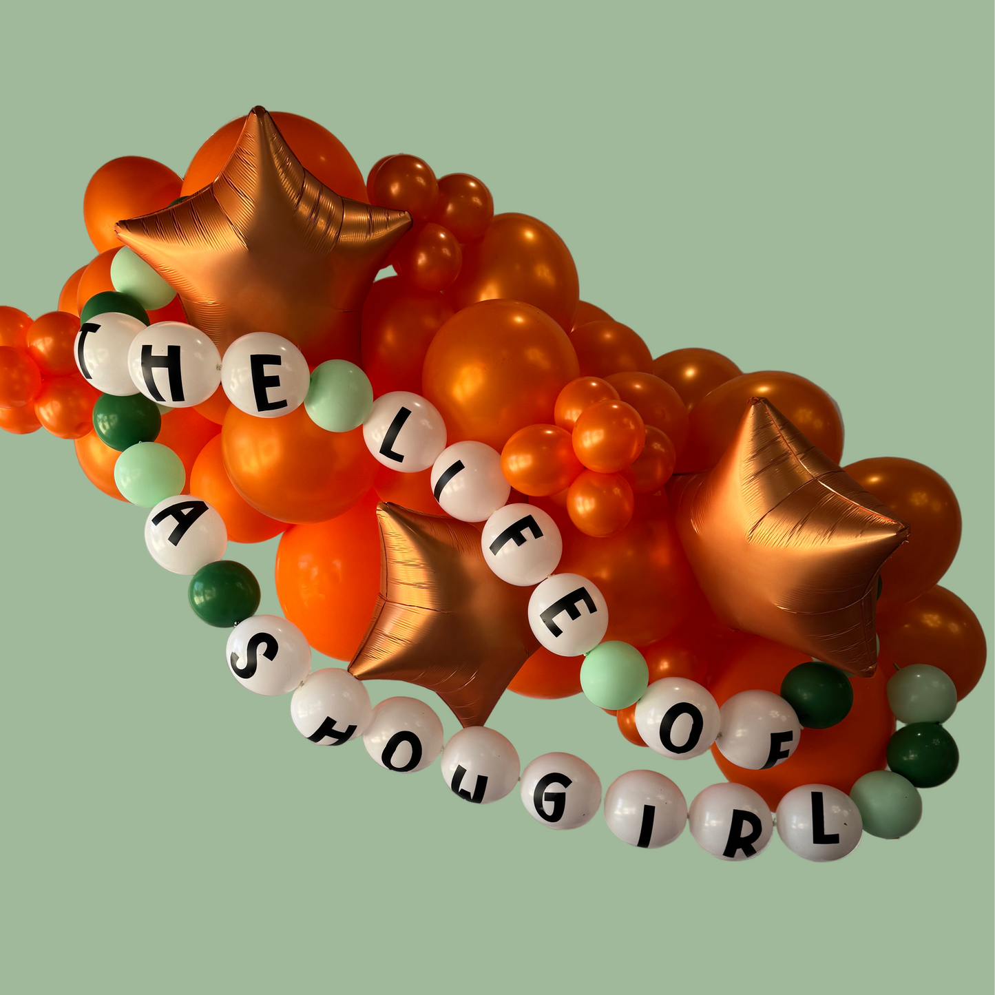 - 5' balloon garland in orange with orange stars and a "The Life of a Showgirl" balloon friendship bracelet