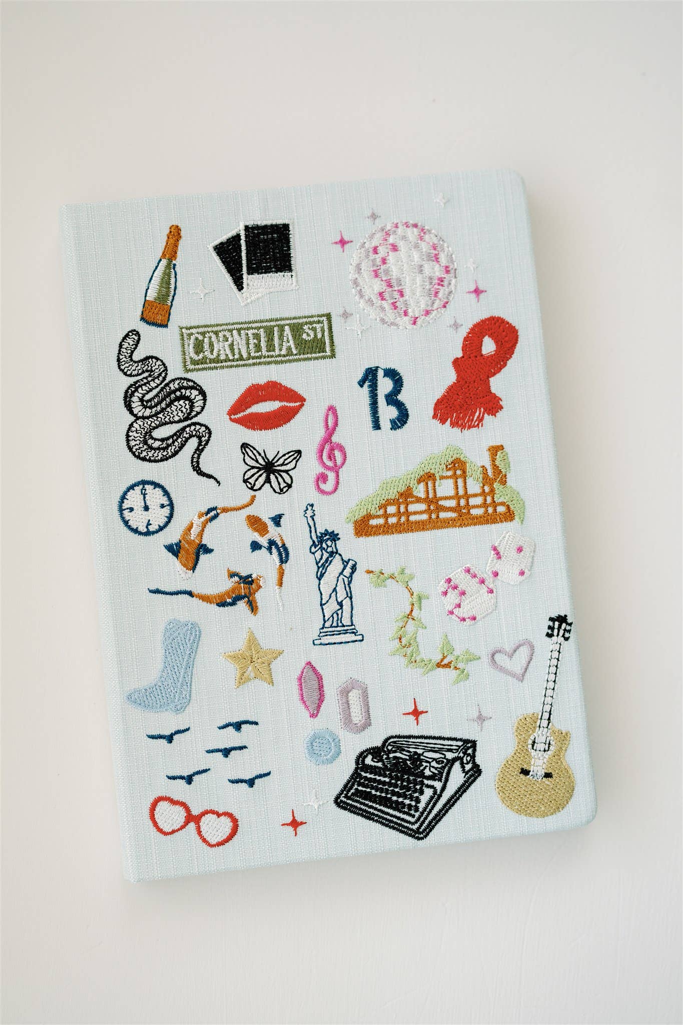 This 5.5x8x8 inch linen hardcover journal features embroidered icons representing Taylor Swift songs and eras! The Reputation Snake, 1989 Polaroids, Midnight's clock, Debut guitar, the Red scarf and more are beautifully embroidered onto the light sea foam cover.