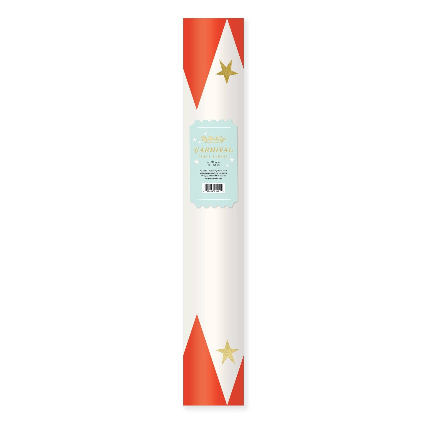 Bring big top vibes to your party table with this carnival inspired table runner. Featuring gold foil stars and a carnival inspired print, this table runner is the perfect foundation piece to build a whimsical tablescape around at your next carnival themed celebration